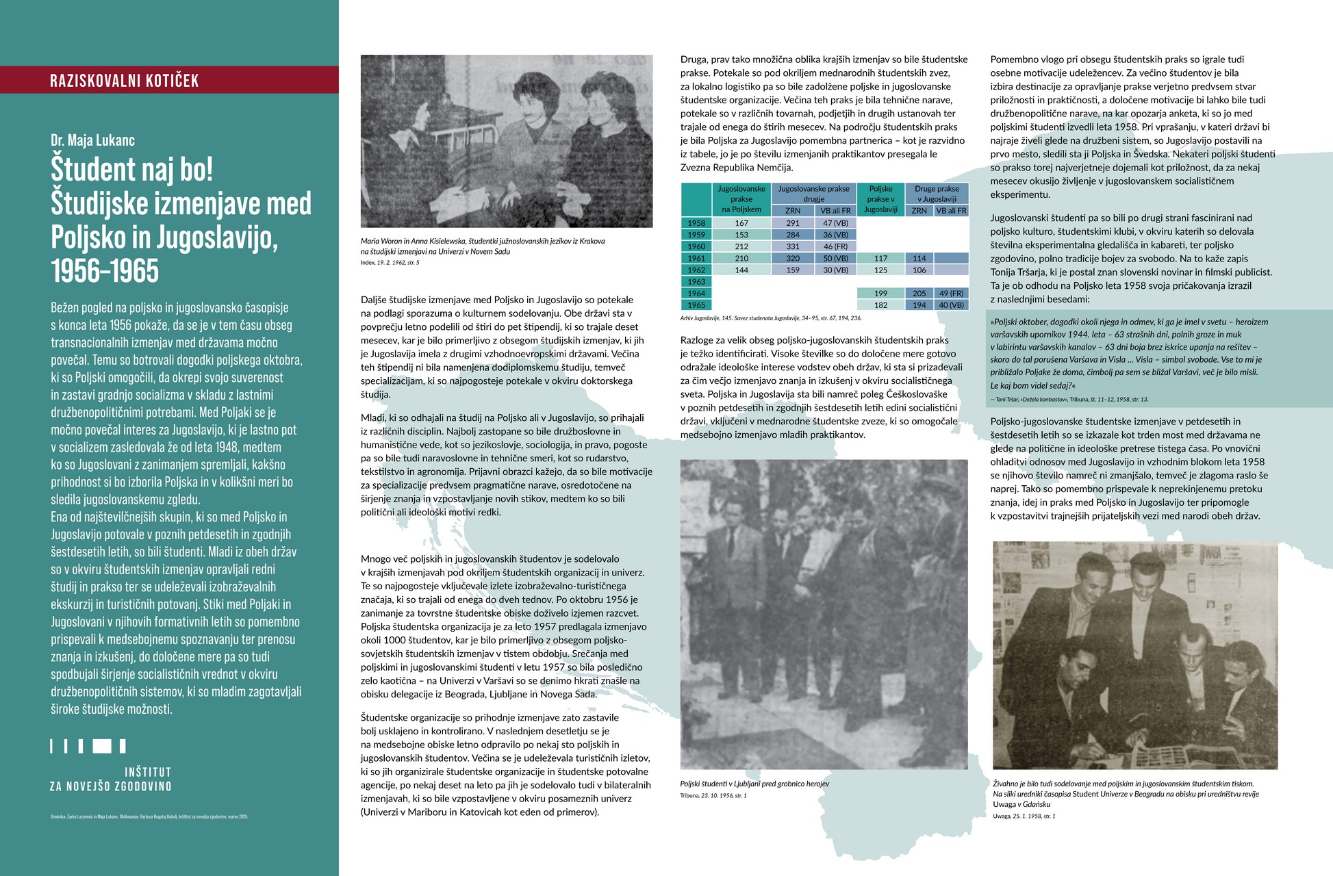 Ena od najštevilčnejših skupin, ki so med Poljsko in Jugoslavijo potovale v poznih petdesetih in zgodnjih šestdesetih letih, so bili študenti. Mladi iz obeh držav so v okviru študentskih izmenjav opravljali redni študij in prakso ter se udeleževali izobraževalnih ekskurzij in turističnih potovanj. Stiki med Poljaki in Jugoslovani v njihovih formativnih letih so pomembno prispevali k medsebojnemu spoznavanju ter prenosu znanja in izkušenj, do določene mere pa so tudi spodbujali širjenje socialističnih vrednot v okviru družbenopolitičnih sistemov, ki so mladim zagotavljali široke študijske možnosti.