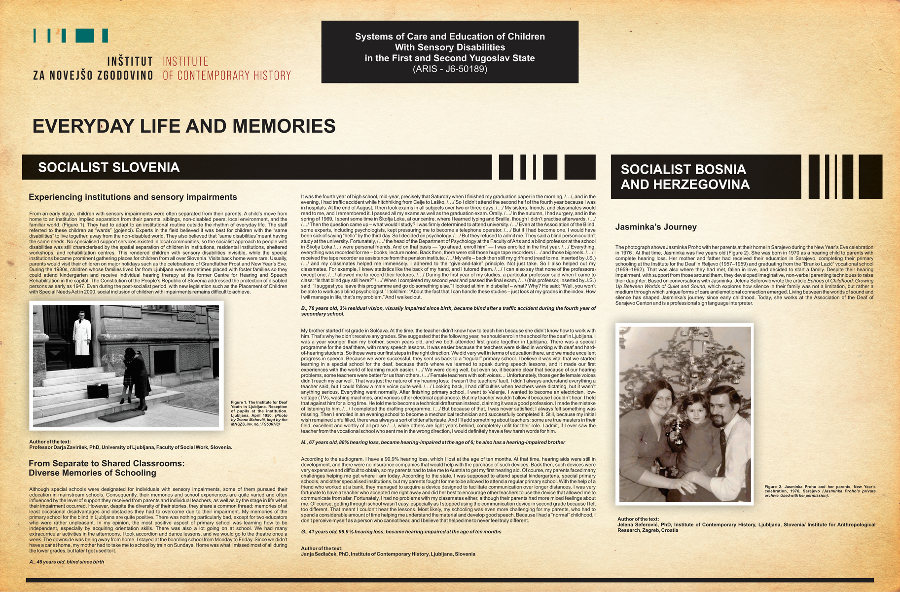 It was the fourth year of high school, mid-year, precisely that Saturday when I finished my graduation paper in the morning, /.. .1, and in the evening, I had traffic accident while hitchhiking from Celje to Laško. /.../S o I didn’t attend the second half of the fourth year because I was in hospitals. At the end of August, I then took exams in all subjects over two or three days. /.../ My sisters, friends, and classmates would read to me, and I remembered it. I passed all my exams as well as the graduation exam. Orally. /.../ In the autumn, I had surgery, and in the spring of 1969,1 spent some time in Škofja Loka, at our centre, where I learned typing and Braille, though I didn’t practise afterwards. I.../ I . ../ Then the question came up - what would I study? I was firmly determined to attend university. /.../ Even at the Association of the Blind, some experts, including psychologists, kept pressuring me to become a telephone operator. I...I But if I had become one, I would have been sick of saying “hello” by the third day. So I decided on psychology. /.../ But they refused to admit me. They said a blind person couldn’t study at the university. Fortunately, /.../ the head of the Department of Psychology at the Faculty of Arts and a blind professor at the school in Škofja Loka /.../ were personal friends. And on that basis — “go ahead, enroll him” — I was enrolled in the first year. /.../ Everything, everything was recorded for me - books, lecture notes. Back then, there were still those huge tape recorders /.../ and those big reels. / . . . / 1 received the tape recorder as assistance from the pension institute. /.../ My wife - back then still my girlfriend (read to me, inserted by J.S.) /.../ and my classmates helped me immensely. I adhered to the “give-and-take” principle. Not just take. So I also helped out my classmates. For example, I knew statistics like the back of my hand, and I tutored them. /.../I can also say that none of the professors,« except one, I...I allowed me to record their lectures. /.../ During the first year of my studies, a particular professor said when I came to class: “ Is that blind guy still here?” /.../ When I completed my second year and passed the final exam, /.../ (this professor, inserted by J.S.) said: “I suggest you leave this programme and go do something else.” I looked at him in d isbelief- what? Why? He said: “Well, you won’t be able to work as a blind psychologist.” I told him: “About the fact that I can handle these studies - just look at my grades in the index. How I will manage in life, that’s my problem.” And I walked out.